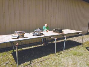 When not in use, Bube breaks the sawhorses down and stacks them in a bucket.
