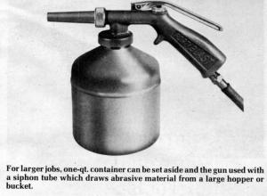 It operates off 60 to 150 psi air pressure and handles a wide variety of abrasives, including silica sand and metal shot. To use, you simply fill the unit's one-quart metal container with abrasive material and connect to an existing air supply.