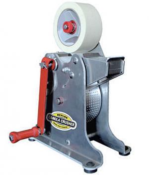 The operator places about a half cup of seed in the hopper, then turns a “crusher handle” 4 times. The crusher counts out the desired number of seeds that pass through 2 notched crushing wheels.