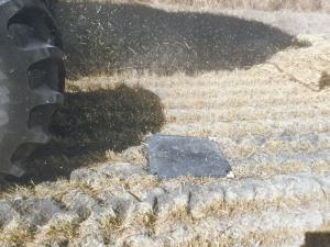 The Bin Buster is designed to be tossed under the rear combine wheel, which makes it less likely to tip on stubble. It’s positioned to get a good sample of chaff and straw coming out of the combine as it passes over.