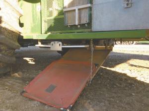 For single combine operators, Hofer suggests making a hinged platform for the pan. He advises hanging it under the body of the combine, but just ahead of a rear wheel. When the operator wants to take a sample, pull or release the platform’s catch allowing the pan to slide down in front of the wheel. After the sample has been checked, replace the pan, adjust the combine if needed, and go.