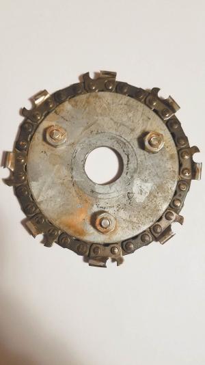 He used a protractor to make a template for the disc, then cut out 2 circular steel plates and bolted them together. A local chainsaw shop made the chain.