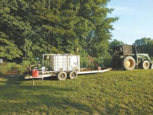McMillan found one 250-gal. tank and a friend gave him a second. He mounted both, along with 2 Rain Bird sprinklers, on the trailer bed. He also mounted a 5 hp. Pacer irrigation pump.