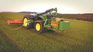 A drum fixed to the front of the tractor carries up to 3,000 ft. of cable, which is fed out and reeled in by a robot arm. An intelligent guidance system keeps the tractor from running over the cable. The tractor works at field speeds of up to 12 mph and can be manually controlled by a remote control.