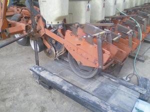 He removed the front bar from the treadmill, then placed the front end of the treadmill underneath where seed drops out between the planter’s seed discs. The treadmill’s original controls are used to adjust the speed at which the seed plates turn.