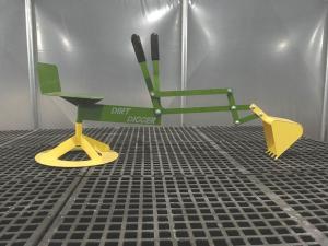 Several years later, he revised the pattern and made a few kits. He had the parts laser cut, then welded them together and added a powder coat finish. Plastic sleeves on the handles make them comfortable for little hands. A round shaft connects the digger to the base and allows the operator to rotate the machine 360 degrees.