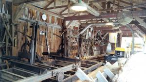 The mill came with a 52-ft. wooden track frame and a center-mounted blade. A wooden carriage rode back and forth to deliver logs to the blade. “The blade was originally driven by a giant belt and pulley system, which was probably powered by a water wheel or by steam,” says Queen.