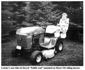 "I know most safety specialists would not recommend this idea, but I figure kids are going to ride along on riding mowers no matter what you do so I decided to make a seat that would keep them safe," says Jeff Lonsky, Rogers, Minn., about the "safety seat" he built for his 2-year-old son that attaches to his Deere 116 riding mower.