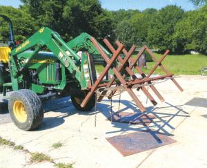 “I use the loader to place the log on the sawhorse and then start cutting up the log. It quickly folds up out of the way for storage.”