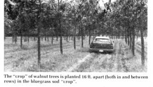 Peterson got help in planning his walnut grove from Robert Wise of the Kentucky Division of Forestry in Elizabethtown, Kty. Wise told FARM SHOW that double cropping of trees with annual crops is not completely new. "It's almost a necessity to get some income off land with a high tax base while waiting for trees to come into production," he says. "Some of the military reservations have been experimenting with corn, hay and wheat under black walnut, but hay or sod are really the only successful crops. We don't want tillage equipment getting into walnut groves where it can cut the roots."