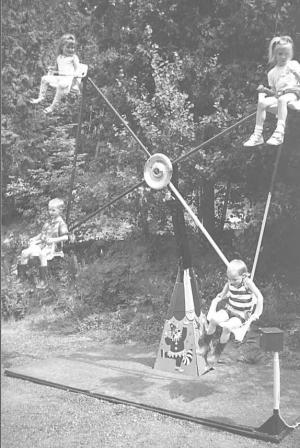 The 4-seat wheel mounts on a steel pole that stands on a heavy steel platform covered by 3/4-in. thick plywood. A 1/2-hp electric motor mounts at the base of the pole and belt-drives a gearbox that's geared down at a 10:1 ratio. The gearbox is coupled by U-joint to the bottom of a 1-in. dia. shaft that runs up to the input shaft on a rear end out of a Datsun Z car that mounts on top of the pole. Four 1 1/ 4-in. dia. pipes fasten to the axle shaft that extends out of the rear end. Desjardins used kids' plastic patio chairs with the legs cut off for seats. An L-shaped steel plate bolts to the bottom of each seat and is welded to a short steel shaft mounted in a pillow block bearing at the end of each arm.