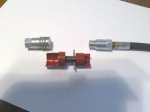 The tool makes use of a center screw with a roll pin. A male hose coupler hooks up to one end and a female coupler to the other. Turning the roll pin one way causes the screw to push against the plunger inside the coupler, which opens a valve to relieve pressure on the hose.