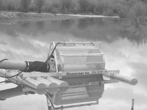 The Riverscreen floats on four pontoons and draws water from more than 35 sq. feet of screening area. Water is delivered through a pipe available in 4, 6, 8, 10, or 12 inch diameter with 150 gpm to 4,000 gpm capacity. A screened rotating drum is supported by an aluminum frame that mounts on the pontoons. Flowing water moves past a series of paddles, which force the drum to rotate while a stainless steel spray bar mounted inside the drum cleans the screen.