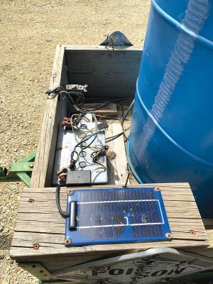 “My spray tank is a 50-gal. poly drum that was just sitting around taking up space,” Nielsen says. “I plumbed a line in the bottom, hooked up 1-in. tubing through a small filter and pump, and put four nozzles on the spray bar. The pump gets power from a 12-volt deep cycle battery that recharges with a small solar panel that I mounted on the top left corner of the trailer box.”