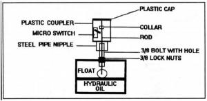 He first drills a 3/8-in. dia. hole in the top of the hydraulic reservoir. Then he welds two lock nuts to the hole and inserts a hollowed out 3/8-in. bolt. A small steel rod with a gas tank float on the lower end extends up through the bolt and into a housing made out of PVC coupler. (The coupler screws into a steel pipe nipple that welds to the bolt). A small microswitch