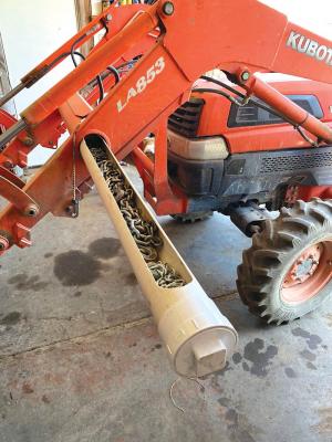The loader frame has a 4-in. dia. tube between the arms just ahead of the tractor. Foley bought a pvc tube to fit inside the tube and cut a wide slot along the top of it, then threaded a pvc cap onto the end of the tube.