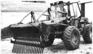 The spring steel tines bolt onto a pair of steel plates that bolt to hinging brackets on the front of the bucket. The cylinders are hooked to brackets welded to the sides of the bucket. The steel tines are spaced about 4 1/4-in. apart. Total cost is about $300 per foot, including cylinders. A stone fork for an 8-ft. bucket sells for about $2,400. (Robert Adelmeyer, N2247 Hwy. K, Campbellsport, Wis. 53010 (ph 414 269-4937)