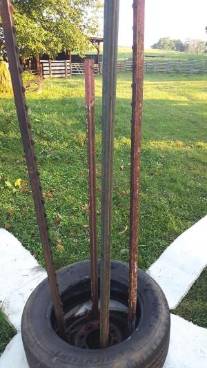 The cattle rub is made from 7 stacked tires and 2 old split wheel rims, with one rim at the bottom of the stack and the other at the top. The tires are held in place by 4 T-posts that set inside holes in the rims. The entire stack of tires is covered by four 12-in. wide carpet strips that Boggs screwed to the bottom and top tires.