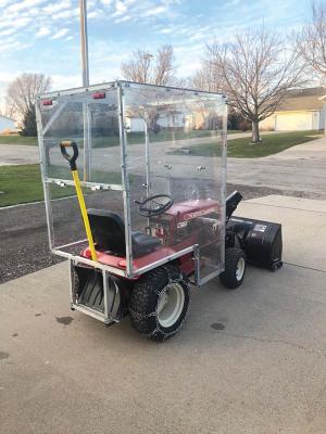 Schminke used 1 by 1-in. steel tubing to frame in the 3-ft. wide, 4-ft. long and 5-ft. tall cab. He used 1/2-in. plexiglass for hinged components and 5/8-in. for the remainder. Aluminum angle brackets bolt everything together and give added stability. He added LED lights on front and clearance and marker lights on back. He did not add a heater, as his main concern was wind and snow.