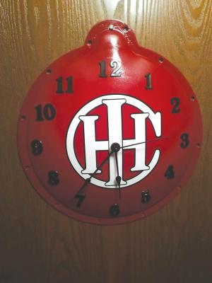 The cream separator’s gearbox cover was used to make another clock, with Dam painting the cover red and adding large white and black Case IH letters in the middle.