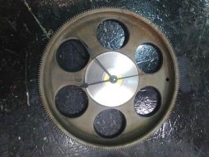 Two large clocks were made from the ring gears off an old International Harvester cream separator. One is 10-in. in dia. and made of cast iron, and the other 6-in. dia., made of brass. Both clocks have 6 large holes at the perimeter, but no numbers. “I install an aftermarket clock kit that includes a motor and hour, minute, and second hands,” says Dam.