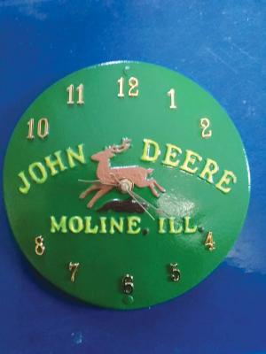 Another pair of clocks was made out of round planter box lids off old Deere and Case 2-row planters. “The Deere clock is 8- in. dia. and the Case 9-in. Both show the company’s logos,” says Dam. “To make these clocks I drilled a hole in the center of each lid and then inserted a clock kit. A threaded bolt attaches the hour, minute, and second hands to the motor.”