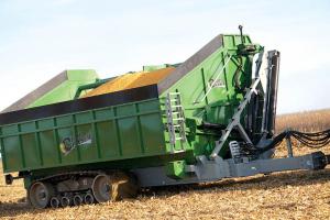 “The baffle and chain conveyors are really the keys to efficient and controlled unloading,” Karg says. “As the cart driver pulls ahead, the chain conveyors deliver only enough crop to fill empty space in the truck. The baffle and chain conveyor work together to prevent overfilling, because the crop stalls out even though the conveyor is still running.”