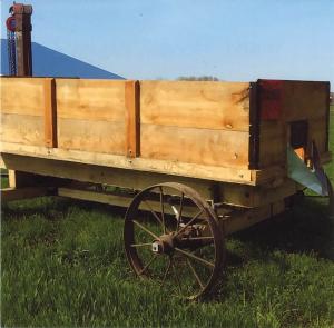 “I clean my own wheat for reseeding and thought an old-fashioned wagon would be just right for supplying the seeder,” says Wiard. “I put the wheat in a gravity box before running it through the cleaner. From there, it goes into the wooden wagon.”