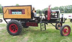 Boquist replaced the tractor’s narrow front end with wide-set wheels to stabilize it during turns and give it more curb appeal. He overhauled the Ford Model A motor, built a new operator platform and double-wide bench closer to the engine, and shortened the steering shaft. He fabricated a solid oak coffin and placed it inside a steel frame mounted behind the bench seat between the rear wheels. Hinged French doors on the back reveal the coffin inside.