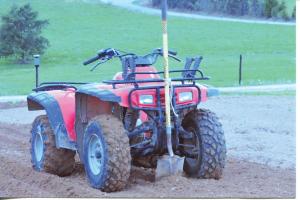 “We tie a shovel to the front of our 4-wheeler and turn it so the back side of the shovel faces forward. It works surprisingly well. When we have to turn at the end of the row, we just pull back on the shovel to lift it out of the ground.
