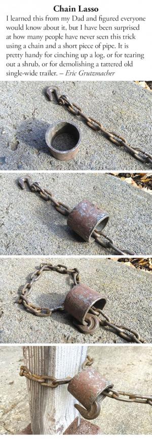 He also tested its pulling power when he needed to demolish an old single-wide trailer. He linked a few chains end to end through a door and window, using the “chain lasso.” It worked well to tear the trailer wall in half, he says.
