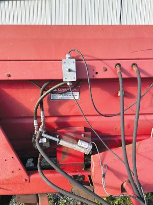 The control box with its toggle switch activates an electric actuator on the assembly mounted to the front of the spreader. It controls the valve to the hydraulic motor powering the apron drive.