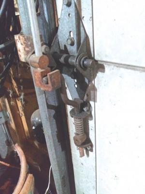 The rod compresses the unlatching spring, located on the top of the rod, which pulls the rod up upon opening the door, pivoting the latches away so that the door hinge below it clears each of the latches as the door moves upwards.