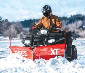 ATV/UTV Hydraulic V-Plow ATV S The 245-lb V-Plow XT from BOSS Products uses a skid-plate style mounting system that bolts directly to the frame of the machine and can V-plow scoop windrow or straight plow your snow with your ATV or mid-size UTV Hydraulic cylinders adjust moldboard halves independently to just the angle you want Retract both cylinders and ends move back 30 degrees for a 58 1/2-in wide V-plow action or tip both forward 30 degrees for a 56 3/4-in snow scoop Angle the full blade up to 30 degrees and windrow a 57 1/8-in swath to one side Straighten to push the full width of the 66-in moldboard blade and then tip the blade upward as much as 30 degrees at the end of the run for effective snow stacking Blades are 18 3/8-in high on the insides and 23 3/16-in high on the outside and flared forward to send snow away from the ATV/UTV Blades are equipped with protective curb guards and a full blade tripping mechanism The 14-ga steel blade skin on each moldboard half is reinforced with four vertical ribs and one diagonal rib on each half The ribs are welded to the skin and a rectangular steel bottom panel The steel panel also reinforces the steel cutting edges on the moldboard “Hydraulic cylinders 1 1/2-in bore 6 1/4-in stroke that adjust the moldboard halves are pinned to the bottom panel ” says Steinbrecher “A third hydraulic cylinder 1 77-in bore with 4 5-in stroke lifts the full blade ” The enclosed hydraulic system is powered by its own electric pump tied into the 4-wheeler’s electrical system It has a maximum draw of 124 amps at 1200 psi It’s fixed to the plow and attaches and detaches with it The hydraulics can be controlled on an ATV by a push bar on the handle with one tab for each cylinder UTVs can use the BOSS SmartTouch 2 keypad Prices may vary slightly by dealer for the V-Plow XT However online distributor www crysteeltruck com lists the ATV V-XT for $3 694 The mid-size UTV V-XT is listed at $3 841 All prices are without assembly A 6-ft 6-in V-XT is available for full-size UTVs It is priced at $4 221 and requires a sub-frame-style mounting system A universal UTV push beam bolts to the subframe Mounting systems are manufactured by BOSS and are machine-specific Contact: FARM SHOW Followup BOSS Products 2010 The Boss Way Iron Mountain Mich 49801 ph 800-286-4155; sales@bossplow com; www bossplow com