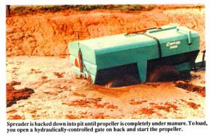 The "Captain" is an agitator and spreader built into one unit. It's equipped with an 18-in. dia. pto-driven propeller on back that agitates and loads manure at the same time and is also used to spread. You actually back the spreader down into the pit until the propeller is completely under manure, then open a hydraulically-controlled gate on back and start the propeller. Once the tank is full you close the gate. To spread manure, you simply open the gate and start the propeller up again. It turns in the same direction whether loading or spreading.