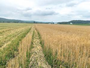 When he harvests in late June, he will flail-mow the straw and the knee-high clover. Later in the summer, he will spread manure and compost on the clover, flail mowing it again in late fall. Spring of 2023, he will plow the clover and straw residue under and plant organic corn.