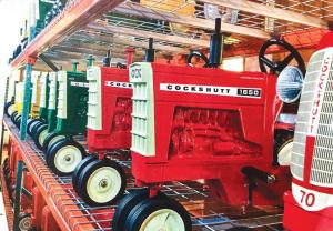 Malsam and his son removed the wooden pews and made them into side wall shelving to hold smaller boxed items. Enclosed glass shelving from a local store now sits in front of the altar, displaying unboxed toys. The main part of the church holds large storage racks that neatly display row after row of colorful pedal tractors. Their collection also includes many farm implements. One of his most unique models is a Farmall M with an American Coleman grader.