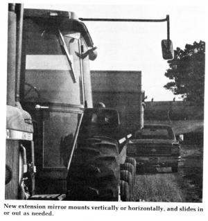 Designed for mounting on Deere Sound Gard cabs, the telescoping mirror arm extends up to 3 ft. You buy the arm assembly (retails for $45) and mount the cab's original mirror on it.