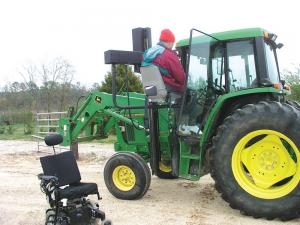 The Pilot Lift can help you transfer from a wheelchair to the seat on the lift, and the powered lift moves to the operator seat and then to the equipment. The Pilot lift and hand controls mount onto the equipment.