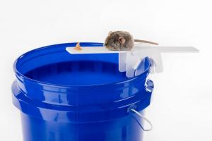 The key to this clever trap is the 13-in long, 1 3/8-in. wide pivoting beam. The trap attaches to the bucket using slots in the base. Push it down onto the bucket lip and place a small amount of peanut butter onto the end of the beam marked bait. The bait is suspended over the center of the bucket.