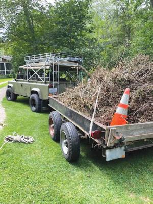 The trailer bed is 5 ft. high by 10 ft. long. “I pack thorny brambles onto the trailer as tightly as I can to minimize trips,” he says.