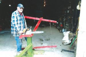 The starter uses a series of levers to pull on a cord connected from a foot pedal to the chainsaw’s starter, which he rests on a waist-high platform. One or two gentle pumps with the foot are usually enough to start the chainsaw, providing it’s well-primed. He has the chainsaw fastened down so it doesn’t jump around.