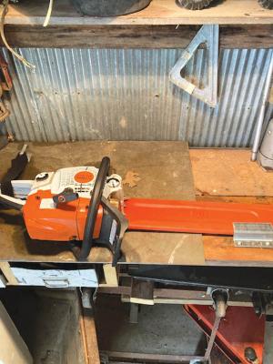 “Makes it easy to yank on the starter rope so I can get it going and warmed up. Once I go out to use it, I have a starter rope extension that makes it easier to start the warmed-up saw while it’s lying on the ground. I made a cord out of clothesline with a wooden handle on one end and a choke knot on the other to go over the handle on the starter rope. It lets me start the saw while standing erect with my foot on the saw handle.”