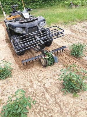 Sieting took the tine bar off the tow-behind carriage and mounted it on his ATVs modified front end. He had previously replaced the ATV’s snowplow push tube with a receiver hitch with a riser hitch on it.