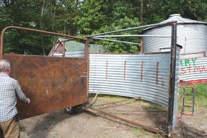 “I built my gate first, then started from the center post welding the braces and upright bars out to the circumference,” he says. “Then, I used two layers of rounded grain bin panels for the half circle of the cattle tub portion. On the top of the panels, I bolted a curved angle iron, so it wasn’t too sharp. Along the inside, I bolted on small angle irons to catch the spring-loaded gate handle as it closed.”