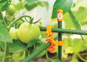 Simply push the center to attach them to stakes. Remove them by pushing on the hooks on both ends. Hooks, slots, and holes allow them to be connected at different angles and work with netting, string, and ties to secure plants.