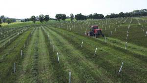 By 2024, 180,000 chestnut trees had been planted, making it the largest chestnut operation in the U.S. Black locust trees for eventual timber production were also planted. Owner Keavin Hill collects lease payments and management fees under a 20-year lease. He also produces hay in the alleys between the rows of chestnuts. When the young trees grow past browse height, Hill plans to use the land for managed grazing in winter and early spring.