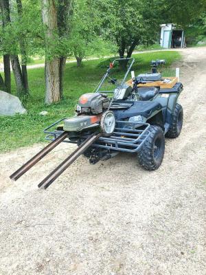 Homemade Trimmer Carrier ATV S Using a walk-behind lawn tool can require pushing it a considerable distance or up a hill to where it’s needed Norm Sieting was tired of doing just that so he made a super simple carrier for his gas-powered 4-cycle heavy-duty wheeled trimmer “I modified a cargo carrier I bought for my car to go on the front receiver hitch of my ATV ” says Sieting “Then I rigged up some tracks to set on the carrier so I can wheel the trimmer up and on ” The tracks were short sections of channel iron salvaged from a house trailer frame They have a slight bend about a foot from the end that sits on the carrier Sieting welded a piece of pipe under the bend to serve as a spacer and an anchor point for the tracks When the tracks are placed on the carrier the pipe sets behind the front railing of the carrier When the tracks aren’t needed they can be lifted off and set aside; no tools are required “The forward end of the tracks rest on the ground until I push the trimmer up and onto the cargo carrier ” explains Sieting “As I do that they rock up and out of the way as I drive I can drive to the spot where I need to use the trimmer and unload just as quickly ” Looking ahead to the day pushing the trimmer into place is difficult to do the 78-year-old mounted a 12-volt winch on the front of the ATV “I’ll be able to winch the trimmer into place ” says Sieting Contact: FARM SHOW Followup Norman Sieting 6112 Walker Rd NW Rapid City Mich 49676 ph 231-564-1031; normansieting@gmail com
