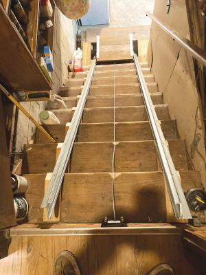 Sieting quickly discovered that the tracks, spliced at 8 ft., didn’t run smoothly. Luckily, his friend had a set of 12-ft. tracks, enough for the full stair run.