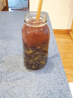 “It tasted kind of winey,” she says. “So, I strained out the fruit and let the liquid set a couple more months.” She removed the fruit because she had experienced mold in apple vinegar when the fruit was left in too long.